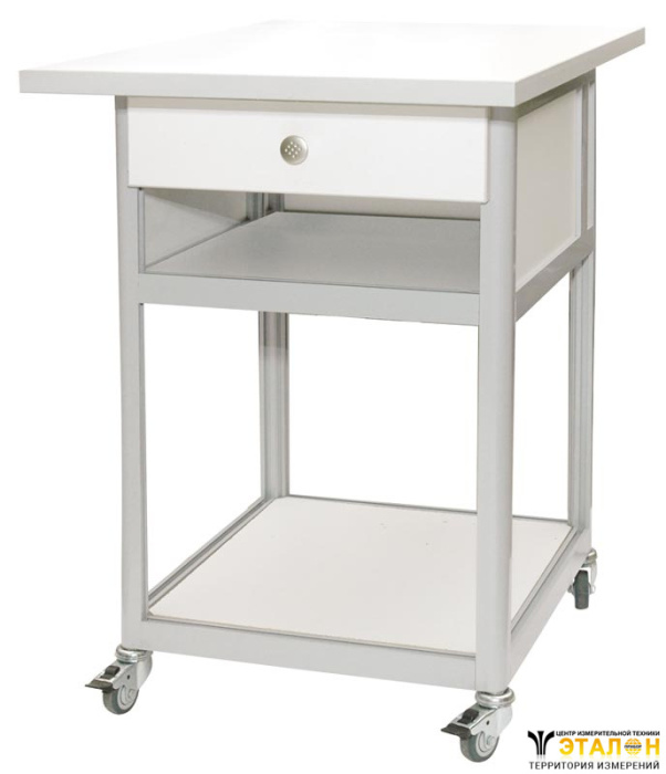 Наличие выдвижного ящика и двух полок позволяет разместить оборудование и комплектующие или аксессуары, что очень удобно при перемещении подкатного стола между разными рабочими местами. В этом случае аксессуары (соединительные провода, ЗИП) всегда находятся рядом с местом работы с оборудованием, размещенным на подкатном столе.