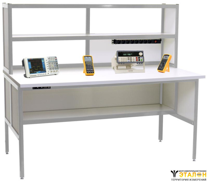 У стола метролога/поверителя АРМ-4510-9 имеются две полки 100x30 см без задней стенки над столешницей, что позволяет удобно расположить измерительные приборы и другое необходимое оборудование. Также есть полка 100х30 см с задней стенкой под столешницей. В стандартной модификации полки фиксированы по высоте. Для электропитания приборов и оборудования предусмотрен блок из 8 розеток с выключателем. �меются разъемы заземления. Высота 131 см.