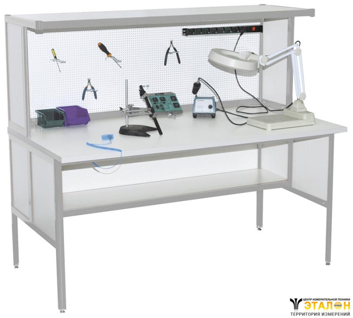 У стола радиомонтажника АРМ-4110-9 имеется одна полка 100 x 50 см над столешницей и полка 100 х 30 см с задней стенкой под столешницей. В стандартной модификации полки фиксированы по высоте. Перфорированная задняя стенка с набором крючков позволяет разместить отвертки, кусачки и другой инструмент, необходимый для работы, чтобы он всегда был под рукой.