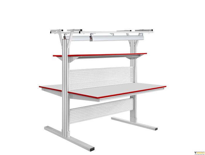 Стол промышленный СПЗ-КП изготовлен на базе конструкционного анодированного профиля 135х45 мм и представляет собой два зеркально расположенных рабочих места. Основным преимуществом серии столов СПЗ-КП является компактная конструкция, которая позволяет разместить его в ограниченном по пространству помещении. Конструкция стола позволяет оснастить стол дополнительным оборудованием.
