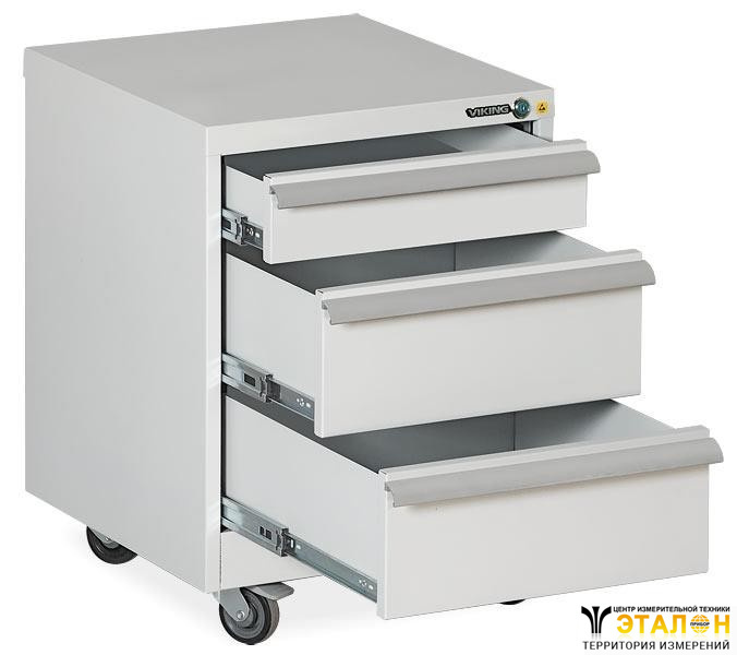 Стальная тумба для хранения инструментов и компонентов ТП-01/S ESD может использоваться в качестве дополнительного элемента рабочего стола. К тумбе монтируются 4 колесные опоры диаметром 100 мм (материал – резина), из них две с механизмом фиксации. Оснащена центральным замком. Выдвижные ящики с механизмом легкого скольжения (телескопические направляющие) выдвигаются на 360 мм.