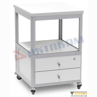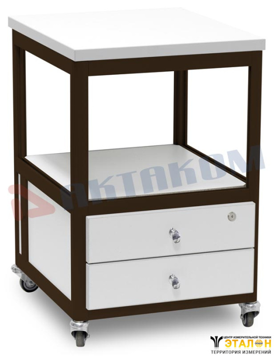 Тумбочка подкатная с двумя ящиками и полкой. Цвет алюминиевого каркаса – коричневый (8017), цвет ДСП - белый. Два выдвижных ящика с лицевыми панелями, один с замком, одна полка 40х40 см, четыре колеса, два из них блокируемые. Стенок вокруг полки нет. Габариты 43х50х66 см.