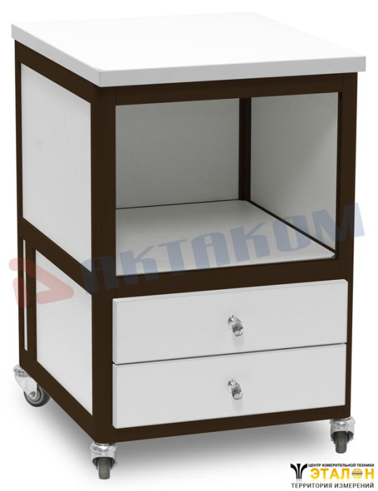 Тумбочка подкатная с двумя ящиками и полкой. Цвет алюминиевого каркаса – коричневый (8017), цвет ДСП - белый. Два выдвижных ящика с лицевыми панелями, одна полка 40х40 см, четыре колеса, два из них блокируемые. Стенка вокруг полки. Габариты 43х50х66 см.