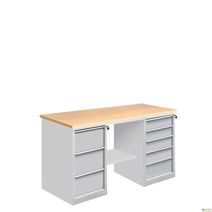 На тумбах установлен центральный замок для индивидуального доступа. Ручки изготовлены из алюминиевого профиля с анодированным покрытием и боковыми пазами для установки обозначения (маркировки) ящиков по их прямому назначению (подразделение организации, документация, инструменты, материалы и т.д.). В зависимости от габаритов используемых инструментов, материалов и оснастки возможно подобрать тумбу верстака с разным количеством ящиков. Нижняя полка верстака изготовлена из металла для устойчивого положения верстака и позволяет организовать хранение материалов.