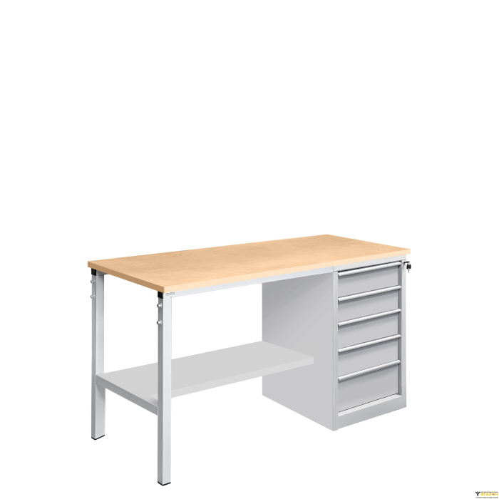 На тумбе установлен центральный замок с ручкой (в комплекте с 2) ключами для индивидуального доступа к инструментам и принадлежностям. Ручки изготовлены из алюминиевого профиля с анодированным покрытием и боковыми пазами для установки обозначения (маркировки) ящиков по их прямому назначению (подразделение организации, документация, инструменты, материалы и т.д.). Нижняя полка верстака, изготовленная из металла для устойчивого положения верстака, позволяет организовать хранение материалов.