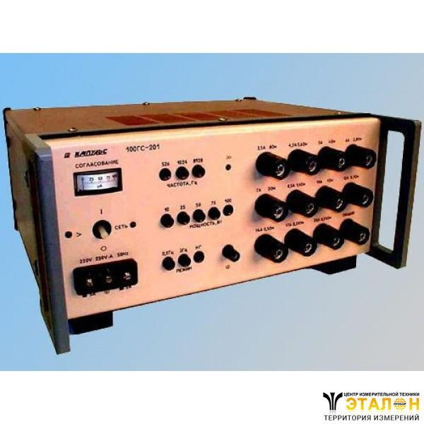 Генератор звуковой частоты специальный 100ГС-201. Генератор обеспечивает выходной сигнал синусоидальной формы с коэффициентом гармоник не более 10%. Рабочие частоты генератора, стабилизированные кварцевым резонатором, 526, 1024 и 8928 Гц. Выходная мощность генератора на нагрузке (0,25 - 8) Ом в режиме НГ на частотах 526 и 1024Гц - не менее 100Вт. Режимы генерации - НГ и с амплитудной модуляцией импульсами частотой 3Гц и 0,2 Гц. Габаритные размеры 185х370х350мм, масса не более 15кг, питание - от сети переменного тока 220В, 50Гц.