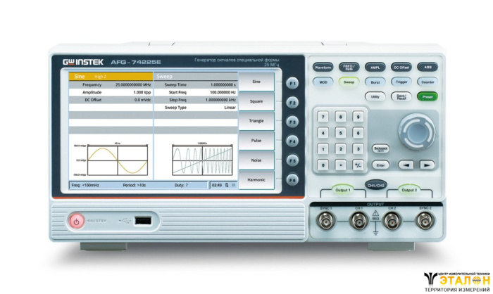 | Особенности | Частота дискретизации 125 МГц (функц. генератор + СПФ). Формы сигнала - стандартные типы + произвольная форма (146 видов). Функция HARMONIC - генерация выходного сигнала с заданными частотными компонентами (до 16-й гармоники). Возможность редактирования СПФ без подключения к ПК. Встроенный частотомер 0,1 Гц… 200 МГц (7 разрядов) |