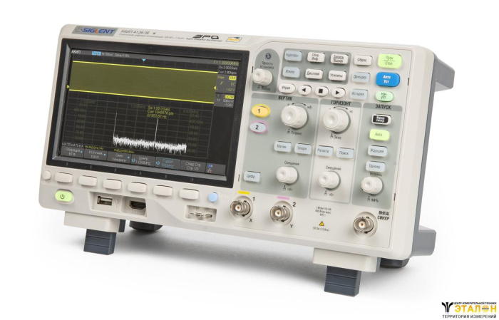 | Особенности | Высокая скорость обновления экрана до 400.000 осц./сек. Режим сегментированной памяти. Режим HISTORY. Интерполяция - Sin X/х, линейная. Автоматические (до 38-и параметров) и курсорные измерения. Математические функции, БФП. Синхронизация и декодирование сигналов I2C, SPI, UART/RS232, CAN, LIN |