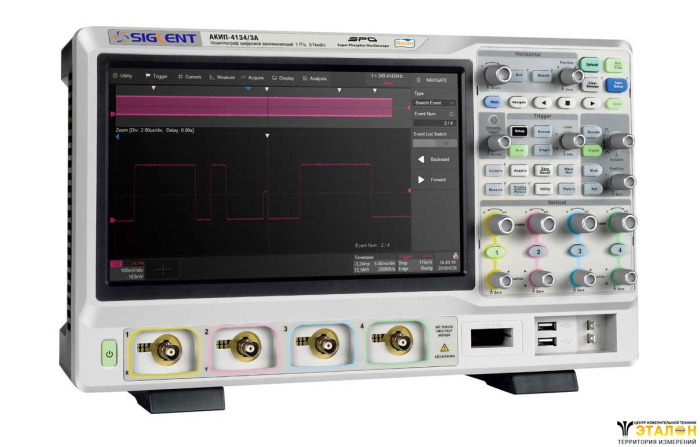 | Особенности | Высокая скорость обновления экрана до 500.000 осц./сек. Режим сегментированной памяти. Режим HISTORY. Интерполяция - Sin X/х, линейная. Автоматические (до 38-и параметров) и курсорные измерения. Математические функции, БФП. Режим «Поисковая машина/ Search» для поиска событий по условиям заданным пользователем. Cинхронизация и декодирование сигналов, стандартно, I2C, SPI, UART/RS232, CAN, LIN, опционально, I2S, MIL-1553, FlexRay. Опция - логический анализатор 16 каналов. Опция - функциональный генератор до 25 МГц. |