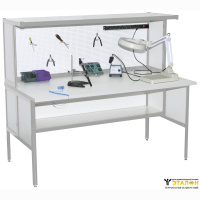 Комплект АЛ-СРСТ-С2-18-7 - стол рабочий на алюминиевом профиле с установленной средней стойкой и светодиодным светильником, отличающийся изяществом конструкции, высокой эргономичностью и удобной системой регулировки рабочих поверхностей - столешницы, полки и освещения по высоте. АЛ-СРСТ-С2-18-7 можетиспользоваться как рабочее место радиомонтажника и как облегченный верстак.