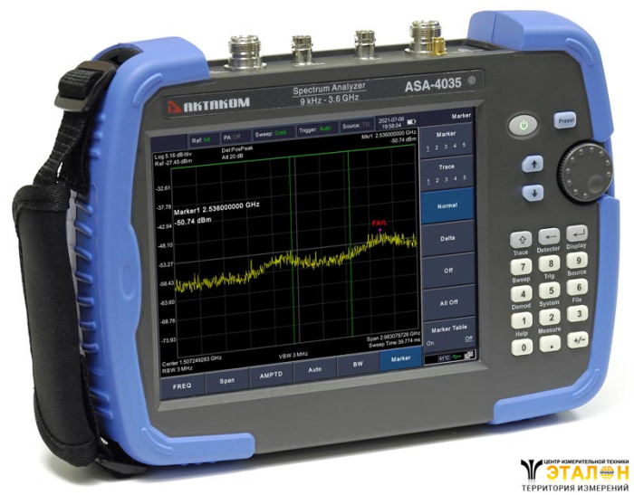 Анализатор спектра портативный АКТАКОМ ASA-4035 обладает всеми измерительными возможностями настольных приборов при небольших размерах и массе. У анализатора спектра ASA-4035 штатно имеется предусилитель, который позволяет легко выявлять даже небольшие по уровню сигналы на фоне шумов, а также функция анализа модуляций, режим спектрограмма, квазипиковые детекторы и ЭМИ-фильтры. Ударопрочный хольстер, батарейное питание и сенсорный экран делают ASA-4035 незаменимым инструментом для работ в "полевых" условиях.
