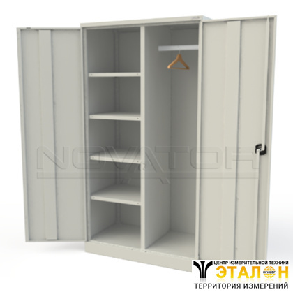 Шкаф металлический двухдверный. Предназначен для одновременного хранения сменной одежды, документации и различного инвентаря. Внутреннее пространство шкафов разделено на две части. Левая часть оснащена 4-мя полками, правая часть оснащена перекладиной для вешалок. Все полки шкафов регулируются по высоте с шагом 50 мм. Допустимая нагрузка на полку < 50 кг.