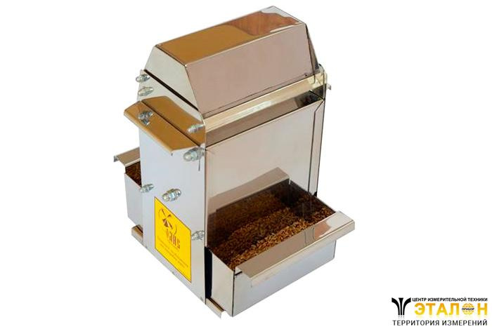 Делитель проб зерна ДПЗ-Р состоит из насыпного бункера, закрепленного на петлевой оси к корпусу, приемной воронки, делительных патрубков и приемных ящиков.Принцип работы состоит в равномерной засыпке зерна из насыпного бункера в делительные патрубки, проходя через которые зерно разделяется на две равные части и поступает в приемные ящики.