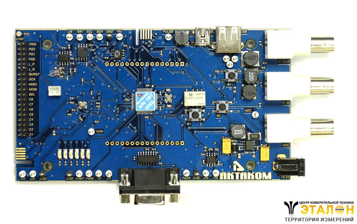 | Полосовой фильтр | F_IN, F_OUT | F_IN – вход фильтра, F_OUT – выход фильтра; Полоса пропускания 8 кГц…700 кГц. При включенном питании платы на сигнале присутствуют импульсные помехи для демонстрации влияния помех на аналоговые сигналы. | |