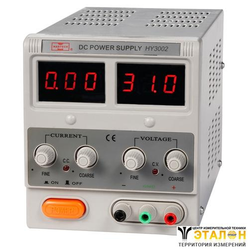 Лабораторный блок питания HY3002 обеспечивает питание электронных устройств и схем постоянным напряжением в диапазоне от 0 до 30 Вольт и током в диапазоне от 0 до 2 Ампер. Регулировка параметров осуществляется потенциометрами. Для каждого параметра отведено по два регулятора (ГРУБО / ТОЧНО). Выходные значения тока и напряжения контролируются на 3-разрядных LED-индикаторах красного цвета.