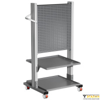 Состоит из разборного алюминиевого профиля, столешницы, изготовленной из композиционного материала, также в комплект входит полка, люминисцентное освещение и перфорированная панель .