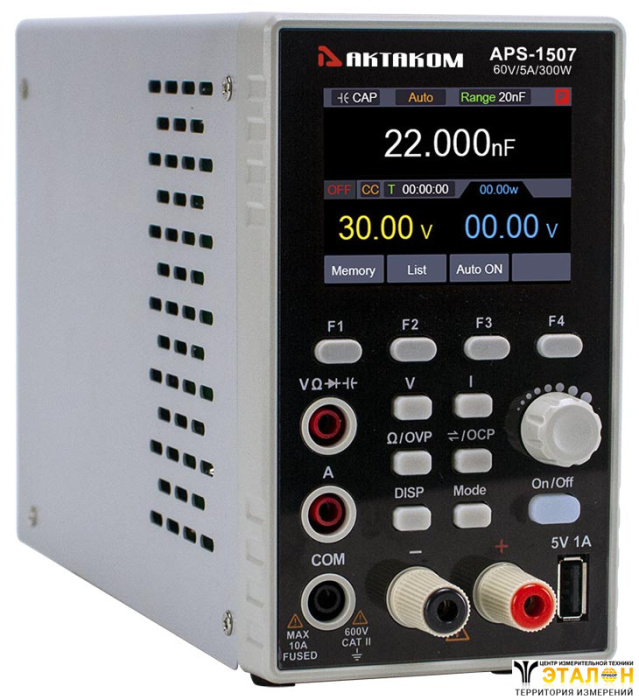 1 Канал. Импульсный. Программируемый. Вых.напряжение / ток : 0…60 В/ 0...5 А. Макс.мощность 300 Вт. Выход USB 5 В/1 А. Разрешение (установка/считывание) 10 мВ/1 мА. Пульсации/шум - 30 мВскз /30 мАскз. Кнопка включения/отключения нагрузки. Функция мониторинга. Работа по списку 10 групп. Сохранение 4 групп. Защита OVP, OCP с заданием. Встроенный мультиметр 4 1/2 разряда. 2,8 " ЖК индикатор . Интерфейс USB. SCPI команды. Размеры 82 x 142 x 226 мм.