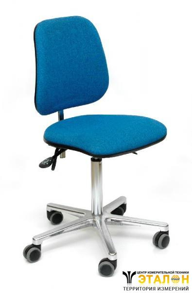 Механическая регулировка высоты и угла наклона спинки и сиденья; размер сиденья 46х43 см, размер спинки 40х39 см; пневматический подъемник, регулирующий высоту сиденья от 45 до 59 см; 5-лучевое хромированное основание с пятью колесами; тканевая обивка. Цвет обивки синий