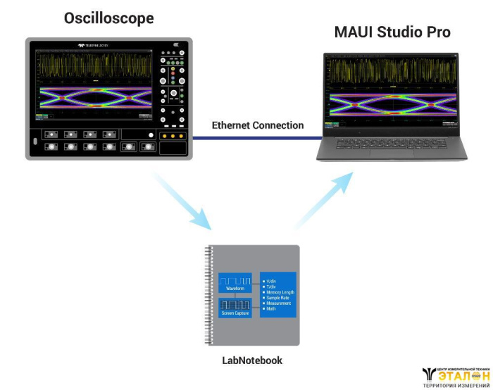Программное обеспечение Maui Studio Pro обеспечивает гибкость для удаленной работы в любом месте, имея при этом все функции осциллографа под рукой. MAUI Studio Pro работает на ПК, что позволяет любому человеку в любом месте выполнять анализ в реальном времени, подключившись к осциллографу через Ethernet-соединение, или выполнять автономный анализ, загружая сохраненный файл LabNotebook.