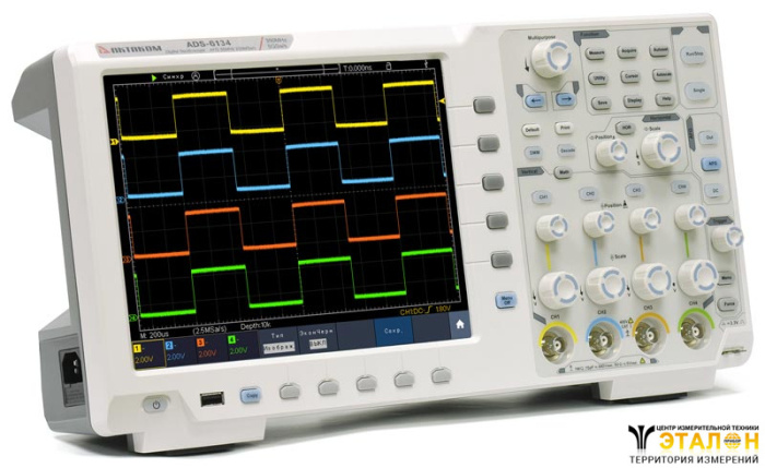 Осциллограф ADS-6134 имеет максимальную частоту дискретизации 5 Гвыб/с, высокую скорость захвата осциллограмм (до 600000 осц/с) и высокую глубину записи 400 млн. точек и большой 10,4" сенсорный тачскрин дисплей. Расширенная система синхронизации включает в себя, в том числе, и запуск по сигналам последовательных шин I²C, SPI, RS-232, CAN.