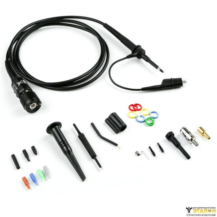 Пассивный пробник-щуп («тонкий»), соединитель BNC. Полоса пропускания 500 МГц, вх. импеданс 10 МОм/10 пФ, коэффициент деления 10:1, макс. Uвх 500 В, толщина раб части тела 2,5 мм, соед. кабель 1,3 м