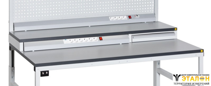 Полка оборудована дополнительной электромонтажной панелью с возможностью расширения: базовый вариант предусматривает 4 розетки и выключатель, также возможна дополнительная комплектация панели еще 2 розетками (на столы 1200 мм), еще 8 розетками (столы 1500 мм) и еще 13 розетками (столы 1800 мм). Под заказ также возможна комплектация УЗО и интернет-розеткой.