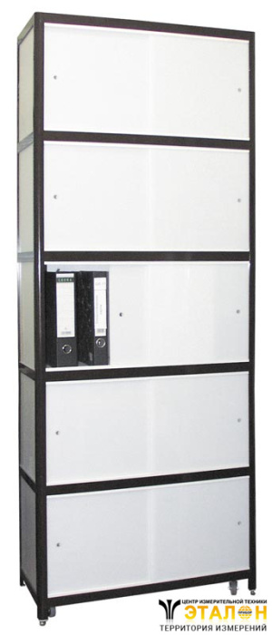 Стеллаж для технической документации. Цвет алюминиевого каркаса - коричневый (RAL-8017), цвет ДСП - белый. Габаритные размеры 78 х 34 х 202 см. 5 полок со сдвижными дверками, 4 колеса, два из них с блокировкой. 4 винтовые ножки.