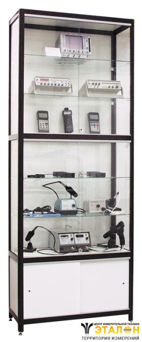 Стойка демонстрационная с фронтальной загрузкой. Цвет алюминиевого каркаса - коричневый (RAL-8017), цвет ДСП - белый. 6 демонстрационных застекленных полок с раздвижными дверками. Внизу 1 техническая полка. Подсветка в двух уровнях (2 светодиодных светильника по 10 Вт). 4 колеса, 4 винтовые ножки. Габариты 780х340х2020 мм.