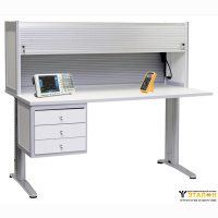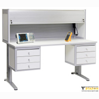 АКТАКОМ АРМ-4715-ESD стол-бюро с антистатической столешницей. Цвет алюминиевого каркаса - серый (RAL-9006), цвет ДСП - белый. Подвижная система жалюзей с двумя замками. Столешница размером 100х80 см из антистатического меламинированного ДСП толщиной 25 мм. Расстояние от столешницы до пола 750 мм с регулировкой опорами +10 мм. Разъемы заземления. Освещение: светодиодный светильник 10 Вт. Блок из 6 розеток с выключателем. Высота изделия 131 см. В стандартной модификации полки фиксированы по высоте.