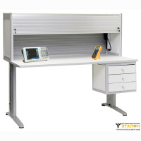 АКТАКОМ АРМ-4755-ESD стол-бюро с антистатической столешницей. Цвет алюминиевого каркаса - серый (RAL-9006), цвет ДСП - белый. Подвижная система жалюзей с двумя замками. Столешница размером 150х80 см из антистатического меламинированного ДСП толщиной 25 мм. Расстояние от столешницы до пола 750 мм с регулировкой опорами +10 мм. Разъемы заземления. Освещение из 2 светодиодных светильников по 10 Вт. Блок из 6 розеток с выключателем. Высота изделия 131 см. В стандартной модификации полки фиксированы по высоте.
