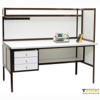 Стол инженера/менеджера АКТАКОМ АРМ-4450 позволяет рационально и удобно организовать рабочее место для эффективной работы. Цвет алюминиевого каркаса - коричневый (RAL-8017), цвет ДСП - белый. Столешница размером 150 x 80 см обладает высокой ударопрочностью, устойчивостью к истиранию, воздействию химикатов (растворителей и т.д.), а также противостоит воздействию температур до +230 °C. Расстояние от столешницы до пола 750 мм с регулировкой опорами +10 мм. У стола АРМ-4450 имеется перегородка высотой 60 см правосторонняя (левосторонняя - по заказу) и одна полка 150x20 см над столешницей. Также есть полка 150х30 см с задней стенкой под столешницей. В стандартной модификации полки фиксированы по высоте. Для освещения рабочего места стол инженера/менеджера АРМ-4450 оборудован двумя светодиодными светильниками по 10 Вт. Для электропитания приборов и другого оборудования предусмотрен блок из 8 розеток с выключателем. Высота 134 см.