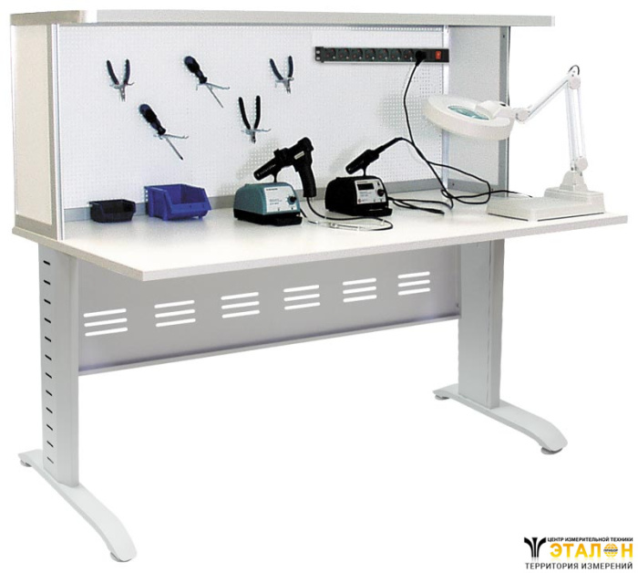 Для освещения рабочего места монтажный стол АРМ-4125 оборудован двумя светодиодными светильниками по 8 Вт. Для электропитания приборов и другого оборудования предусмотрен блок из 8 розеток с выключателем.