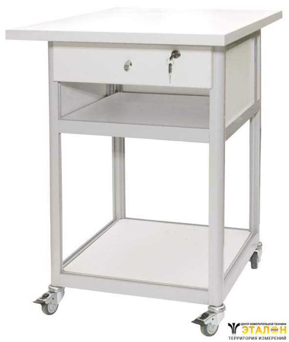 Наличие выдвижного ящика и двух полок позволяет разместить оборудование и комплектующие или аксессуары, что очень удобно при перемещении подкатного стола между разными рабочими местами. В этом случае аксессуары (соединительные провода, ЗИП) всегда находятся рядом с местом работы с оборудованием, размещенным на подкатном столе.