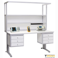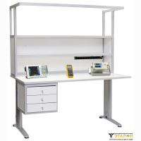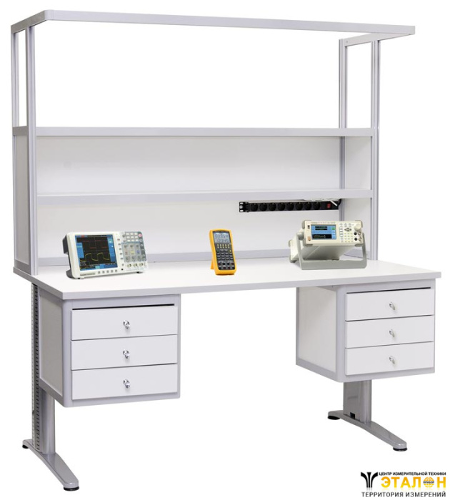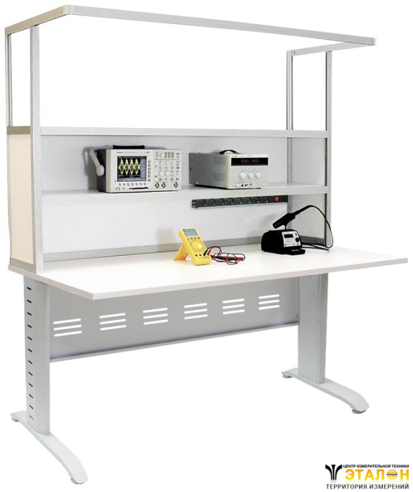У антистатического стола АРМ-4255-ESD имеются две полки 150x30 см с задней стенкой над столешницей, что позволяет удобно расположить измерительные приборы и другое необходимое оборудование. В стандартной модификации полки фиксированы по высоте, но их можно передвинуть вверх на нужное расстояние (при этом будут просветы между ДСП и профилем). В верхней части установлена кронштейн-штанга по всей ширине стола, на которой можно разместить подвесной инструмент.