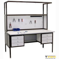 Стол слесаря-сборщика радиоаппаратуры АКТАКОМ АРМ-4320 позволяет рационально и удобно организовать рабочее место для эффективной работы. Цвет алюминиевого каркаса - коричневый (RAL-8017), цвет ДСП - белый. Столешница размером 120 x 80 см обладает высокой ударопрочностью, устойчивостью к истиранию, воздействию химикатов (растворителей и т.д.), а также противостоит воздействию температур до +230 °C. Расстояние от столешницы до пола 750 мм с регулировкой опорами +10 мм. У стола АРМ-4320 имеется одна полка 120x30 см над столешницей. В стандартной модификации полки фиксированы по высоте, но их можно передвинуть вверх на нужное расстояние (при этом будут просветы между ДСП и профилем). Также есть одна полка 120 x 30 см с задней стенкой под столешницей. Перфорированная задняя стенка с набором крючков позволяет разместить отвертки, кусачки и другой инструмент. Для освещения рабочего места стол слесаря-сборщика радиоаппаратуры АРМ-4320 имеет двухуровневое освещение из 4 светодиодных светильников по 8 Вт. Для электропитания приборов и оборудования предусмотрен блок из 8 розеток с выключателем. Имеются разъемы заземления. Также установлена кронштейн-штанга по всей ширине стола, на которой можно разместить подвесной инструмент. Высота 171 см.
