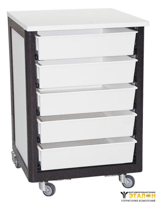 Тумбочка подкатная 43х49х65,5 см. Цвет алюминиевого каркаса - коричневый (RAL-8017), цвет ДСП - белый. Четыре колеса без блокировки. Пять ящиков 33х40х8 см, без лицевых панелей.