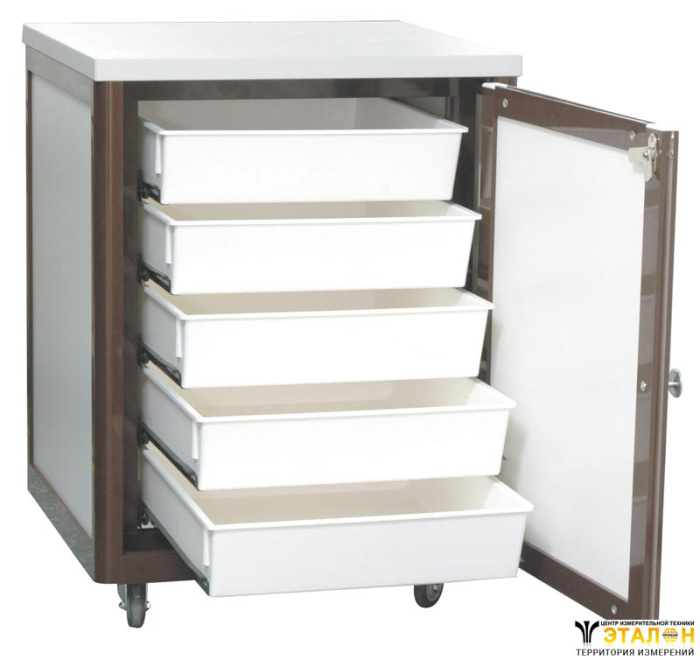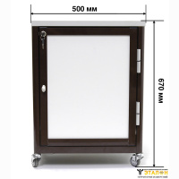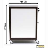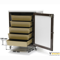 Тумбочка подкатная 50х48х67 см. Цвет алюминиевого каркаса - коричневый (RAL-8017), цвет ДСП - белый. Четыре колеса без блокировки. Пять ящиков 38x43x10 см, без лицевых панелей. Общая дверца из оргстекла с замком.