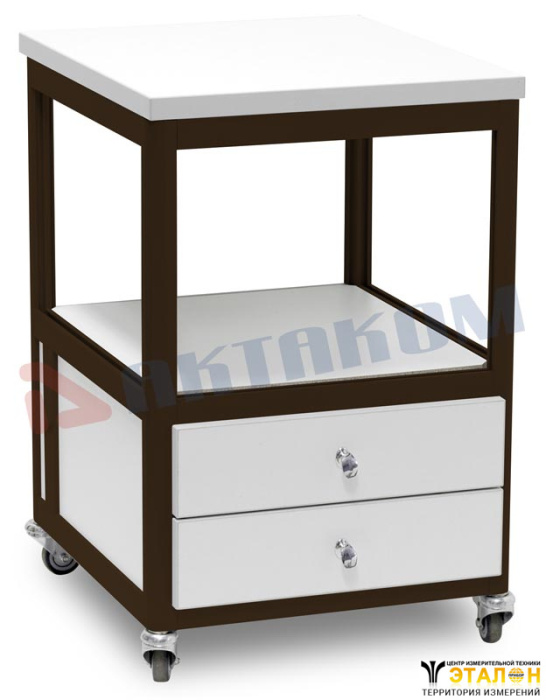Тумбочка подкатная с двумя ящиками и полкой. Цвет алюминиевого каркаса – коричневый (8017), цвет ДСП - белый. Два выдвижных ящика с лицевыми панелями, одна полка 40х40 см, четыре колеса, два из них блокируемые. Стенок вокруг полки нет. Габариты 43х50х66 см.
