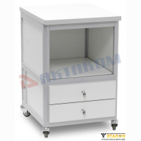 Тумбочка подкатная с двумя ящиками и полкой. Цвет алюминиевого каркаса – коричневый (8017), цвет ДСП - белый. Два выдвижных ящика с лицевыми панелями, одна полка 40х40 см, четыре колеса, два из них блокируемые. Стенка вокруг полки. Габариты 43х50х66 см.