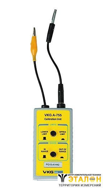 Калибратор VKG A-755 используется для периодического (раз в квартал и после смены батарейки в VKG А-750) контроля величины и погрешности диапазонов измерения тестера VKG А-750.