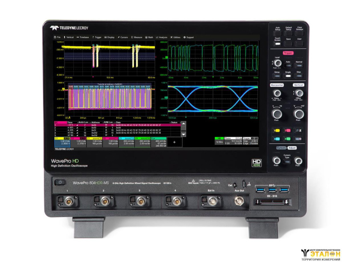 | Особенности | Пользовательский интерфейс MAUI + One Touch. Режимы WaveScan, TriggerScan, History, сегментированная развертка. Измерения и математика - расширенный набор. Возможность интеграции с пакетами MathCad, MatLab, Excel. Приложение LabNotebook – для создания отчетов и документирования результатов работы. Подключение внешнего монитора. Поддержка программных опций по синхронизации и декодированию протоколов (SPI, UART, CAN, LIN, FlexRay, USB, MIL-STD-1553 и пр.), анализу мощности (PWR), цифровые фильтры (DFP2), анализатор спектра (SPECTRUM), измерение ЭМС импульсов (EMC). |