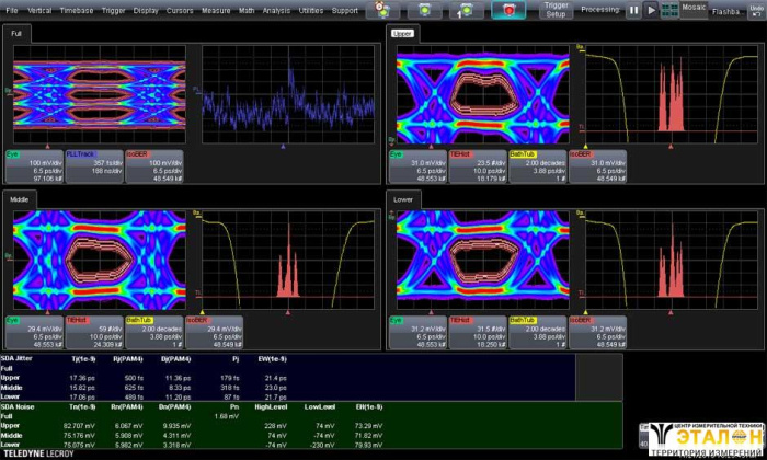 Пакет полного анализа сигналов PAM4 (амплитудно-импульсная модуляция с четырьмя уровнями амплитуды). Программный пакет позволяет измерять параметры глазковой диаграммы, прогнозировать закрытие в зависимости от BER. Измерения джиттера, разделение джиттера на детерминированную Dj и случайную Rj составляющие, анализ шума, общего джиттера и визуализации шума, составить графики IsoBER