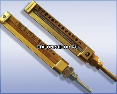 Термометр с прикладной шкалой, состоящий из толстостенного капиляра, помещенного в защитную металлическую оправу. Деления шкалы на поверхности капилляра соответствуют температурным отметкам на корпусе защитной оправы. Нижняя часть оправы изготавливается из латуни или нержавеющей стали с резьбой разного типа.