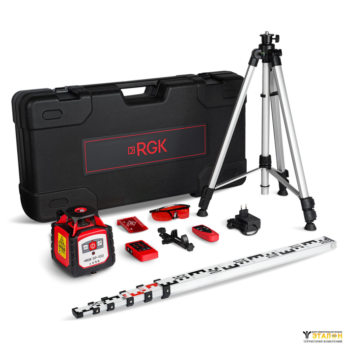 Комплектация: уровень RGK SP-100, пластиковый кейс, руководство на русском языке, пульт ДУ, кронштейн для установки на рейку и крепление, защитные очки, лазерная мишень, приёмник излучения, ЗУ.