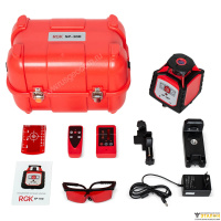 Комплектация: уровень RGK SP-100, пластиковый кейс, руководство на русском языке, пульт ДУ, кронштейн для установки на рейку и крепление, защитные очки, лазерная мишень, приёмник излучения, ЗУ.