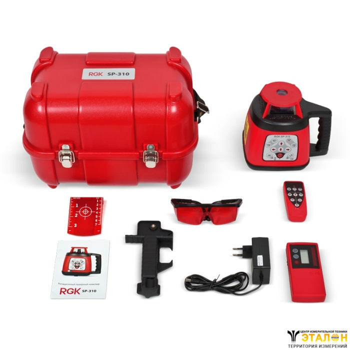 Комплектация: Ротационный лазерный нивелир RGK SP310, приемник излучения, пульт дистанционного управления, кронштейн для установки приемника излучения на рейку, магнитная мишень, руководство пользователя на русском языке, футляр,очки, зарядное устройство.