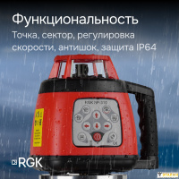 Ротационный нивелир RGK SP-310 - этот профессиональный лазерный прибор, который с точностью 1мм на 10 метров строит плоскость с развёрткой на все 360°C, что полностью исключает необходимость перестановки или поворота. Благодаря ротационному механизму, лазерная система нивелира обеспечивает большую дальность работы: мощный лазер II класса вращается вокруг своей оси, в сочетании с приёмником излучения обеспечивая дальность работы в радиусе 150 м вокруг прибора. Помимо полного вращения, нивелир имеет функцию построения сегмента заданного угла.