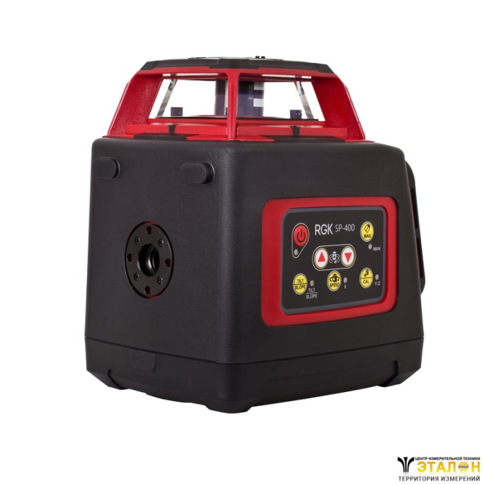Ротационный нивелир RGK SP-400 предназначен для работы с приёмником на расстоянии до 400 метров. Точность горизонтальной плоскости ±1 мм на 10 м, а вертикальной — ±1,5 мм на 10 м. Выравнивание выполняется с помощью сервоприводов в диапазоне ±5°. При выходе за пределы автовыравнивания лазер остановит вращение и отключится.