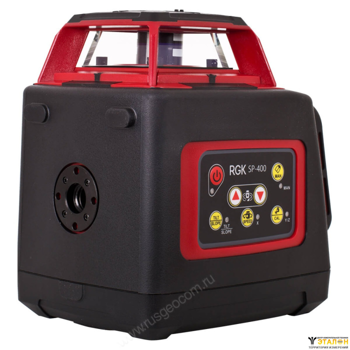 Ротационный нивелир RGK SP-400 предназначен для работы с приёмником на расстоянии до 400 метров. Точность горизонтальной плоскости ±1 мм на 10 м, а вертикальной — ±1,5 мм на 10 м. Выравнивание выполняется с помощью сервоприводов в диапазоне ±5°. При выходе за пределы автовыравнивания лазер остановит вращение и отключится.