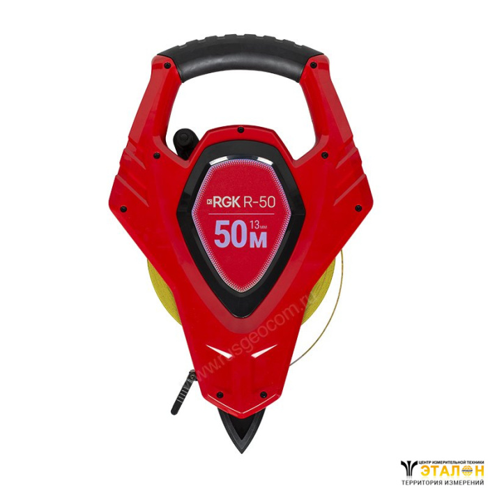 Измерительная рулетка RGK R-50 длиной 50 метров выполнена в открытом корпусе и снабжена механизмом ускоренного сматывания ленты. Нейлоновое покрытие ленты защищает ее от истирания.